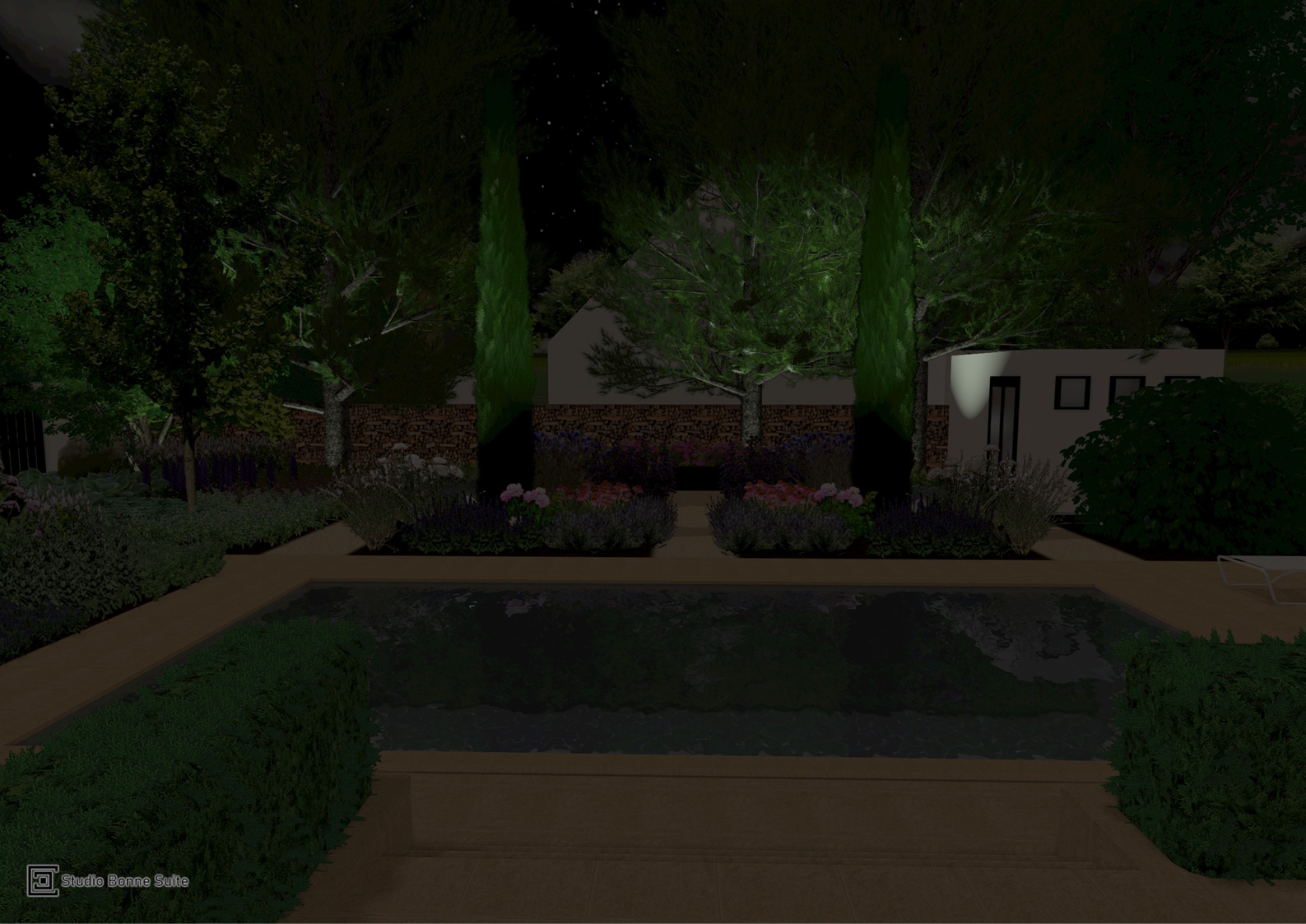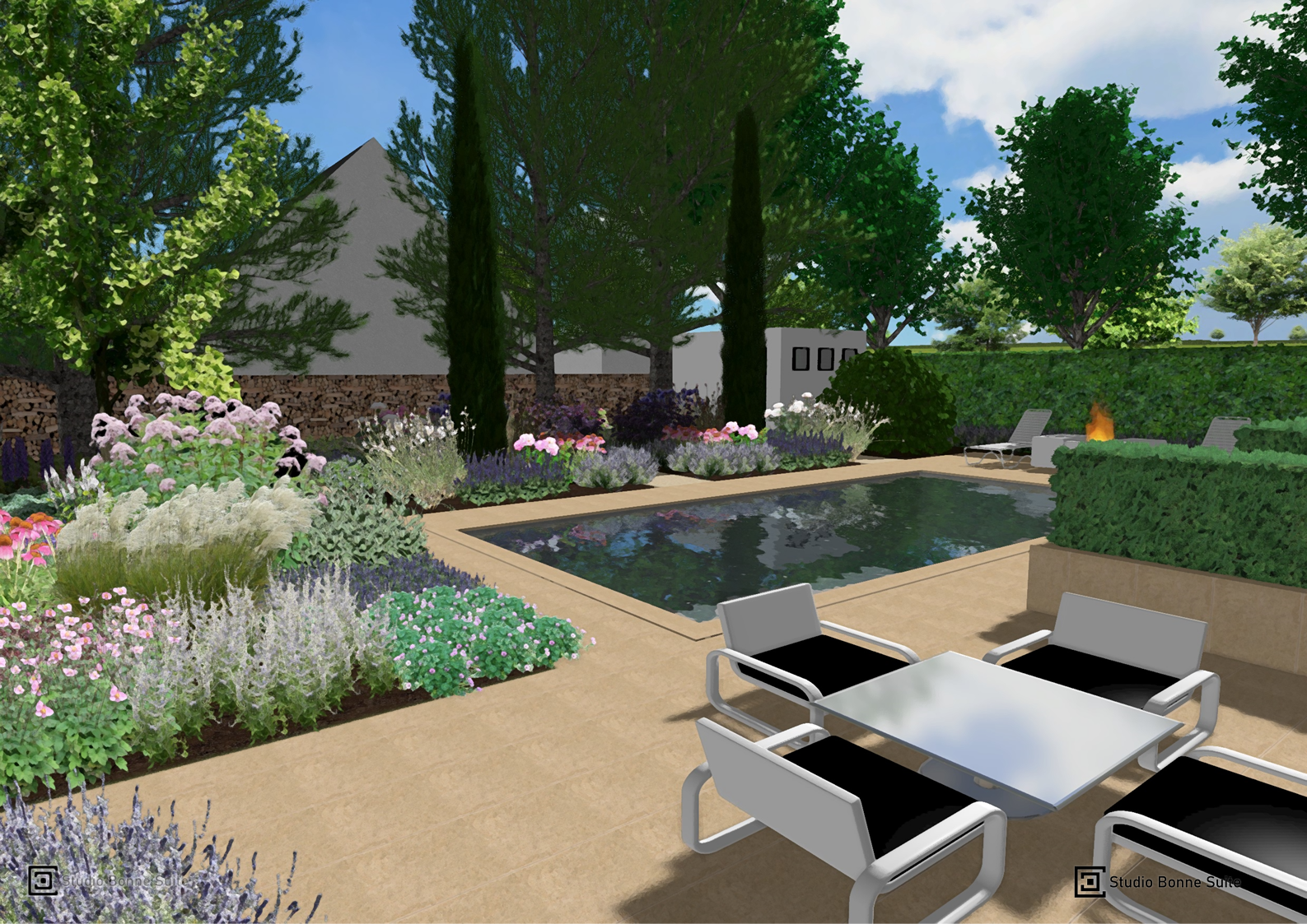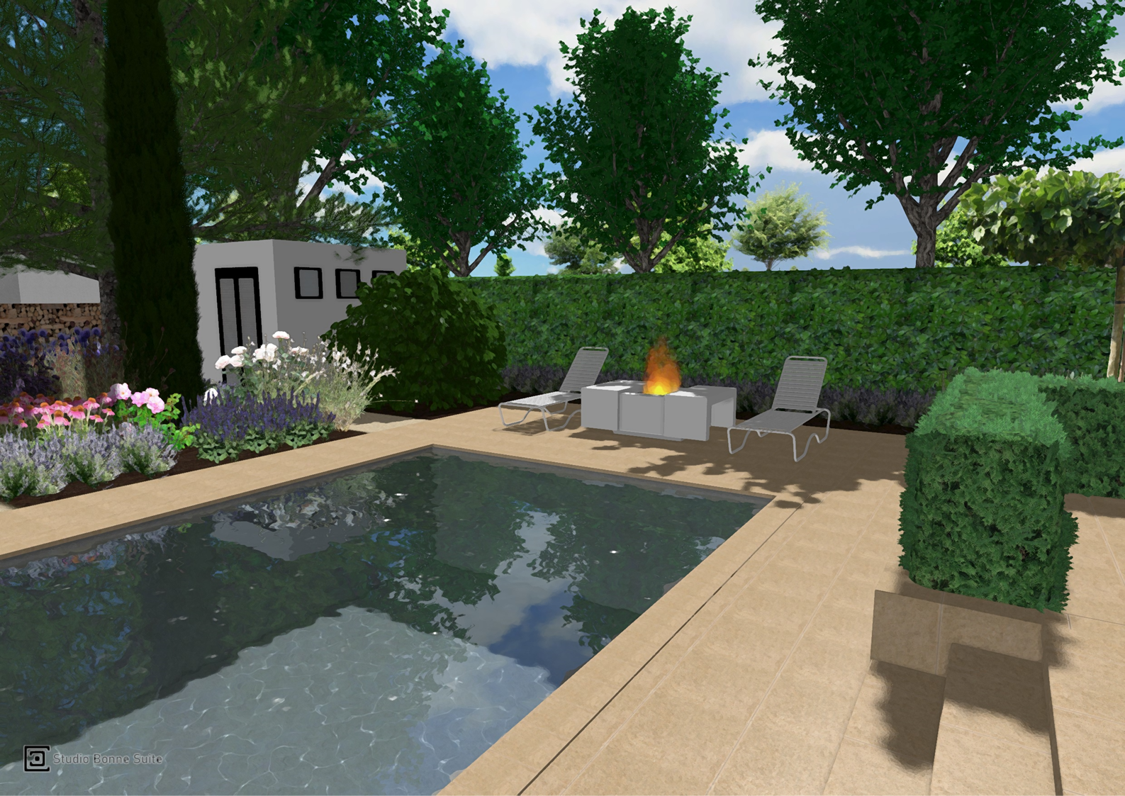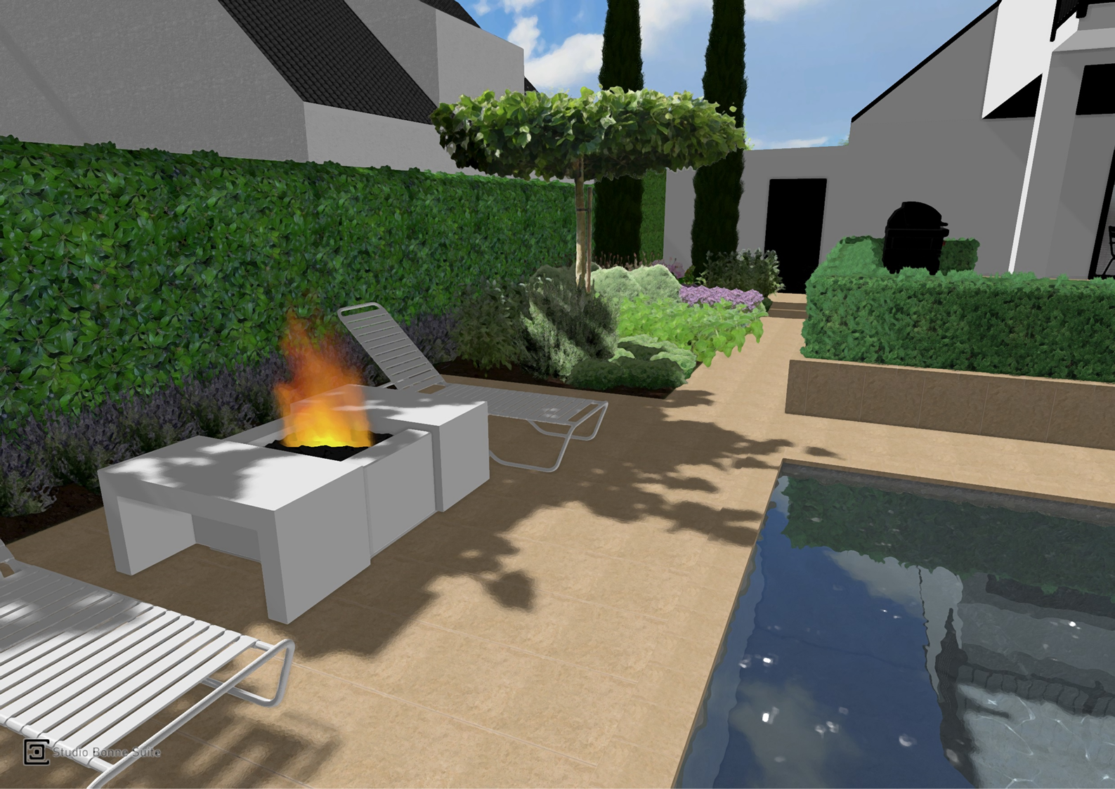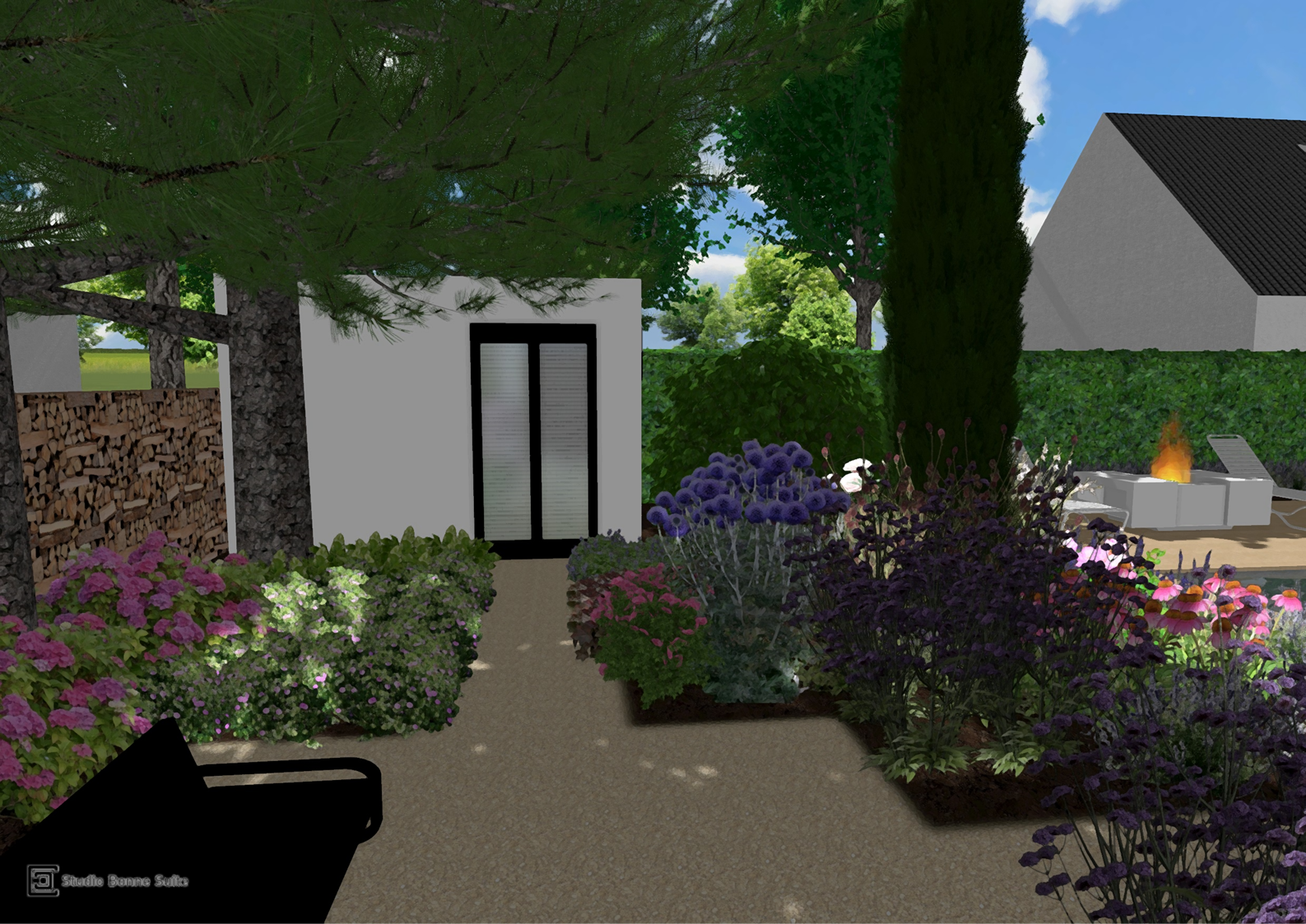 Dieser Garten wurde so gestaltet, dass er eine harmonische Balance zwischen Funktionalität, mediterraner Ästhetik und moderner Technik bietet und dabei die individuellen Wünsche der Bewohner erfüllt. Bereiche für Privatsphäre, Entspannung und praktische Nutzung wurden integriert, darunter eine Ess-Terrasse, eine Sauna, ein Gewächshaus, ein Fahrradschuppen und ein Schwimmbad. Zusätzliche Elemente wie Lagerflächen für Holz, eine Ecke für den Hund und Platz für Gemüseanbau ergänzen die Funktionalität.