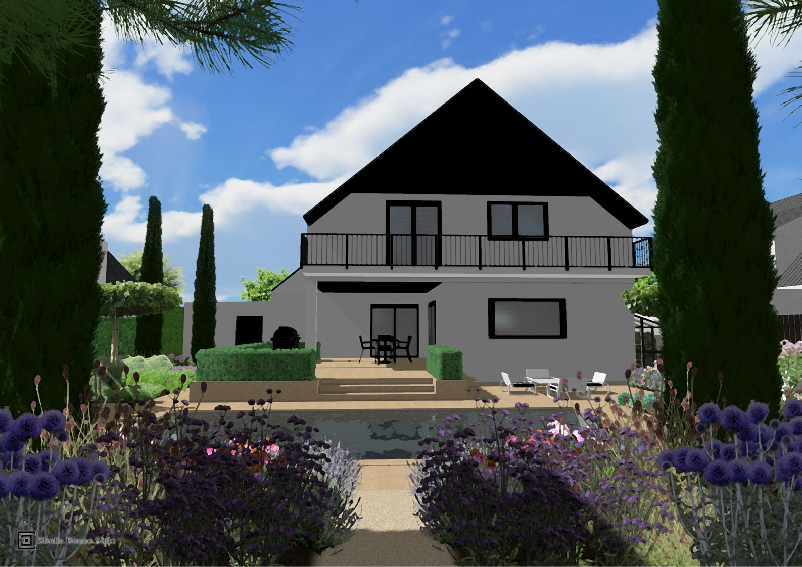 Die moderne Gestaltung mit mediterraner Atmosphäre und duftenden Kräutern lädt zum Verweilen ein. Bienen- und schmetterlingsfreundliche Stauden, eine sandfarbene Pflasterung sowie ein Farbkonzept in Blau, Lila, Rosa, Pink und Weiß sorgen für ein harmonisches Gesamtbild und unterstreichen das Konzept.