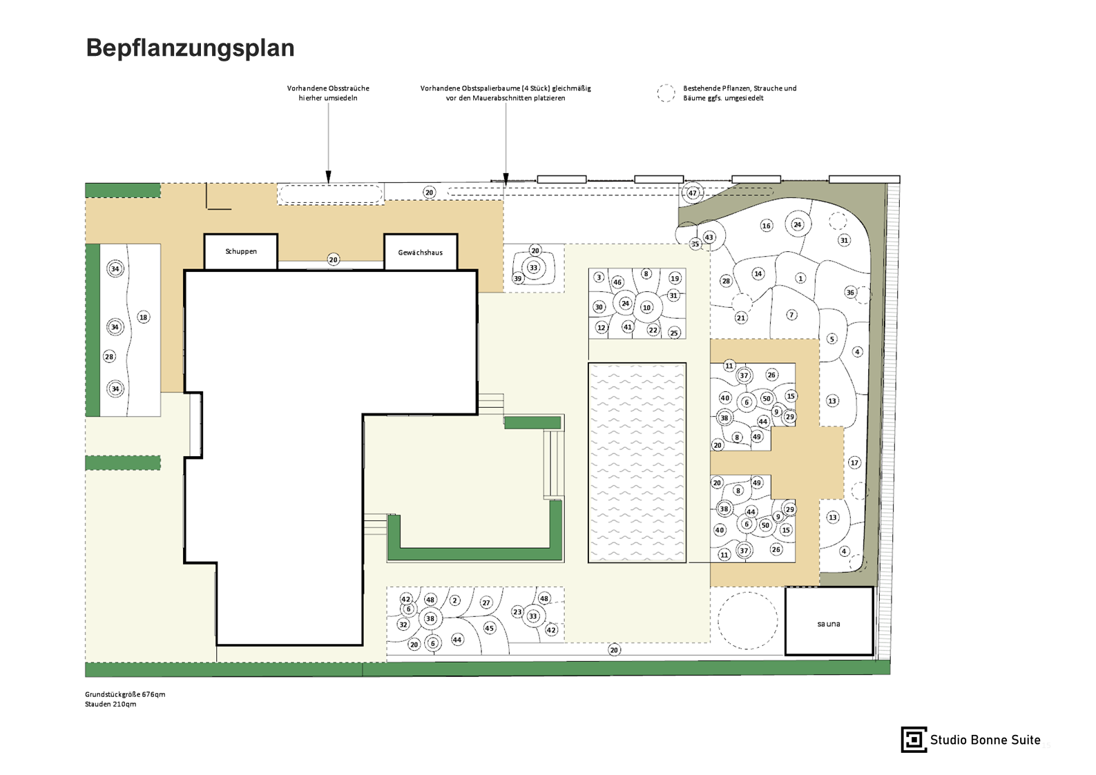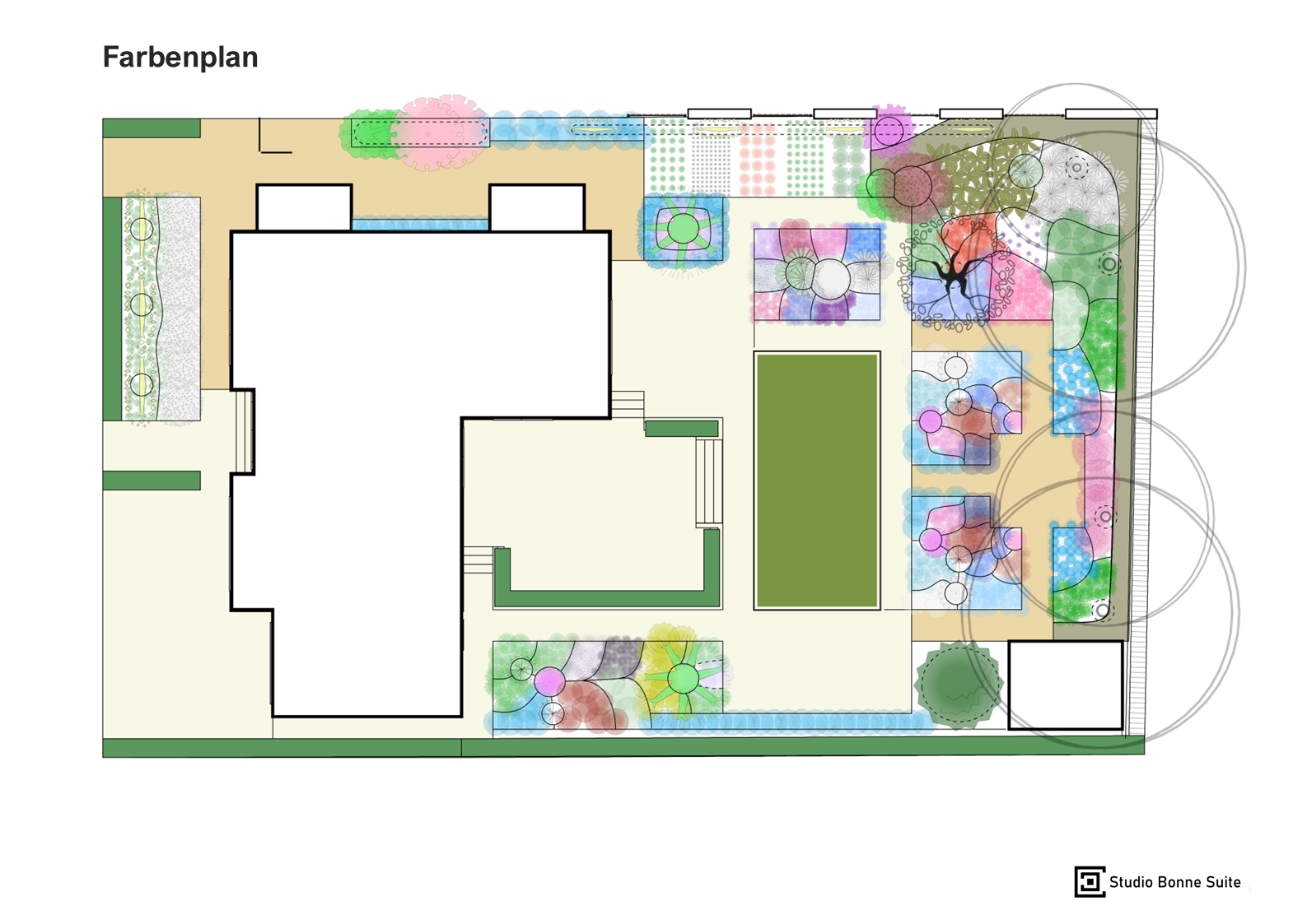 Die technische Planung umfasst Beleuchtung, Steckdosen und ein automatisches Bewässerungssystem, das besonders in trockenen Bereichen wie unter den Tannenbäumen notwendig ist und bei Bedarf erweitert werden kann. Bestehende Obstbäume und Sträucher werden in das Konzept integriert und tragen zur Nachhaltigkeit bei.