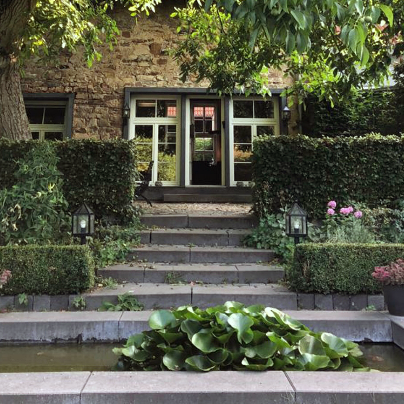 De vijver voor het terras ligt op het zuiden en weerkaast licht onder de boom.