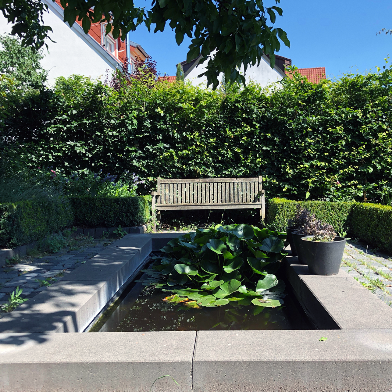 De vijver heeft aan beide kanten banken waarvan altijd wel één in de schaduw ligt; geen overbodige luxe in Zuid-Duitsland
