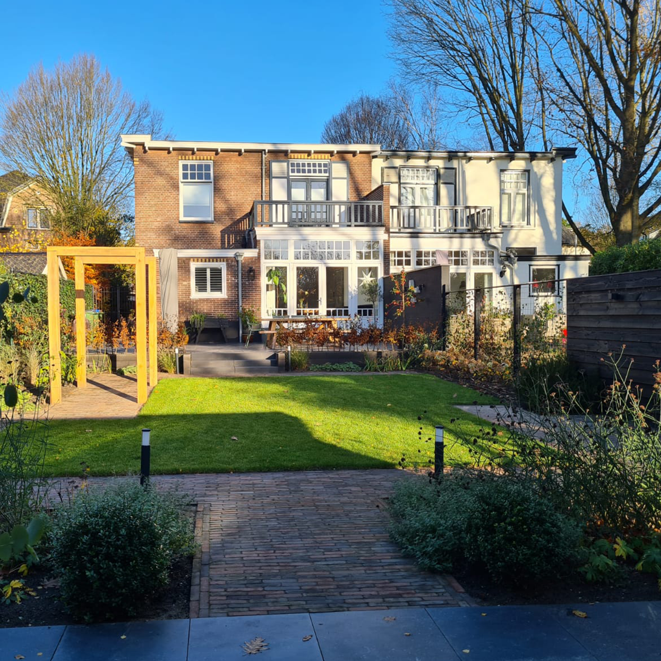 De overkapping is vanuit huis via de zichtlijnen in de tuin verbonden. 's Avonds is het een blikvanger door de sfeervolle verlichting.